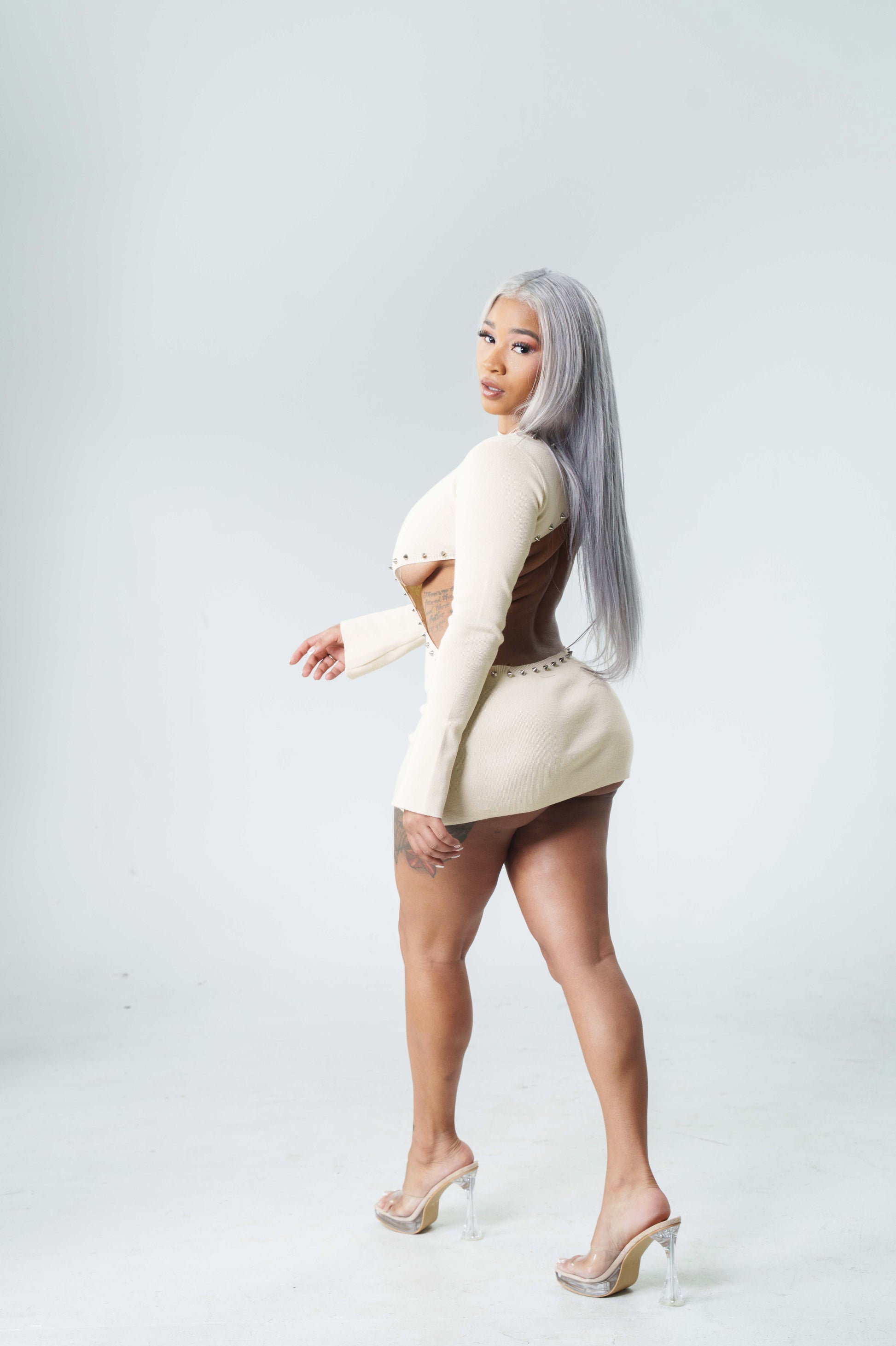 A studded mini dress and sleek cutouts beautifully compliment the soft cotton on your skin, creating a look thats both edgy, and elegant. Perfect for a night out or special occasion.